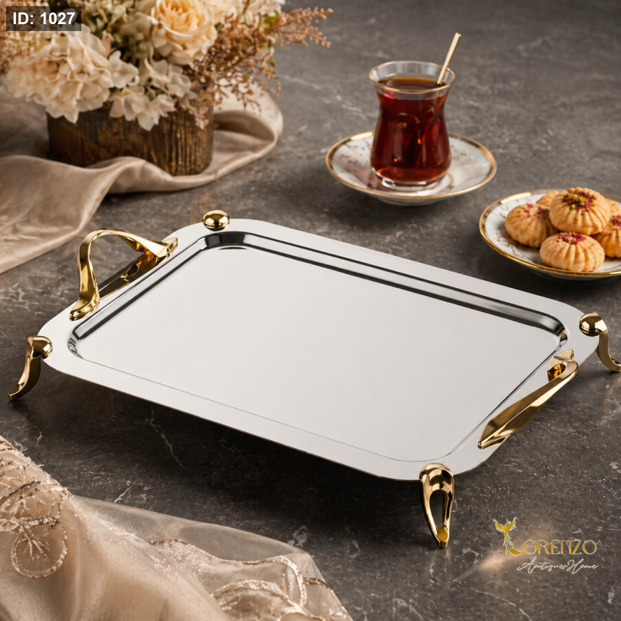 صينية تقديم فاخرة بتصميم أنيق تجمع بين اللمسة العصرية والتفاصيل الكلاسيكية، مثالية لتقديم الضيافة بأسلوب راقٍ يلفت الانتباه. تتميز بسطح لامع عاكس يمنحها مظهراً فخماً، مع مقابض وأرجل باللون الذهبي تضيف لمسة من الفخامة والتميز.