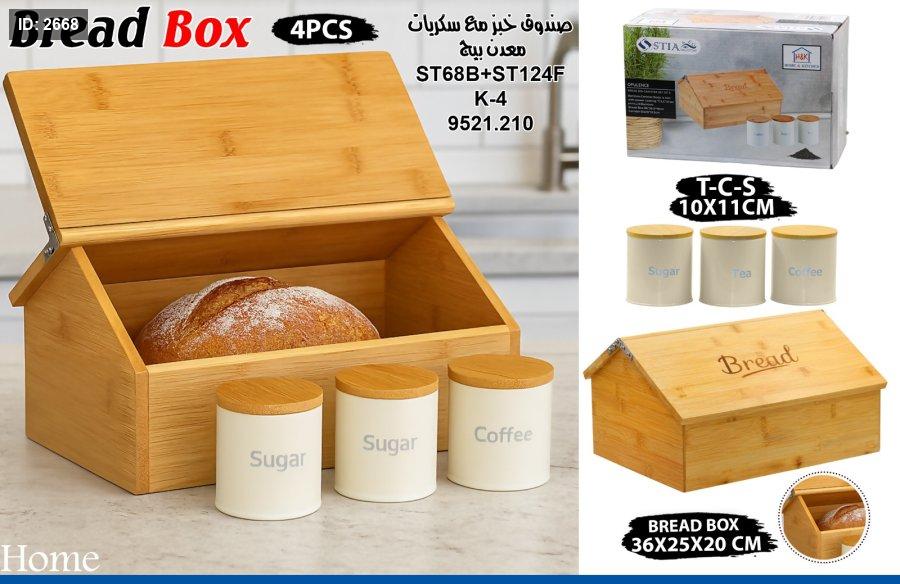 مجموعة من علب التخزين، بما في ذلك صندوق خبز خشبي وثلاث حاويات أصغر للسكر والشاي والقهوة.