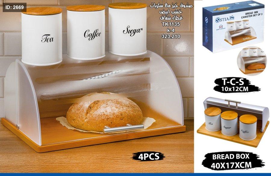 المنتج المعروض في الصورة هو صندوق خبز مع مجموعة من 3 علب لحفظ الشاي والقهوة والسكر.