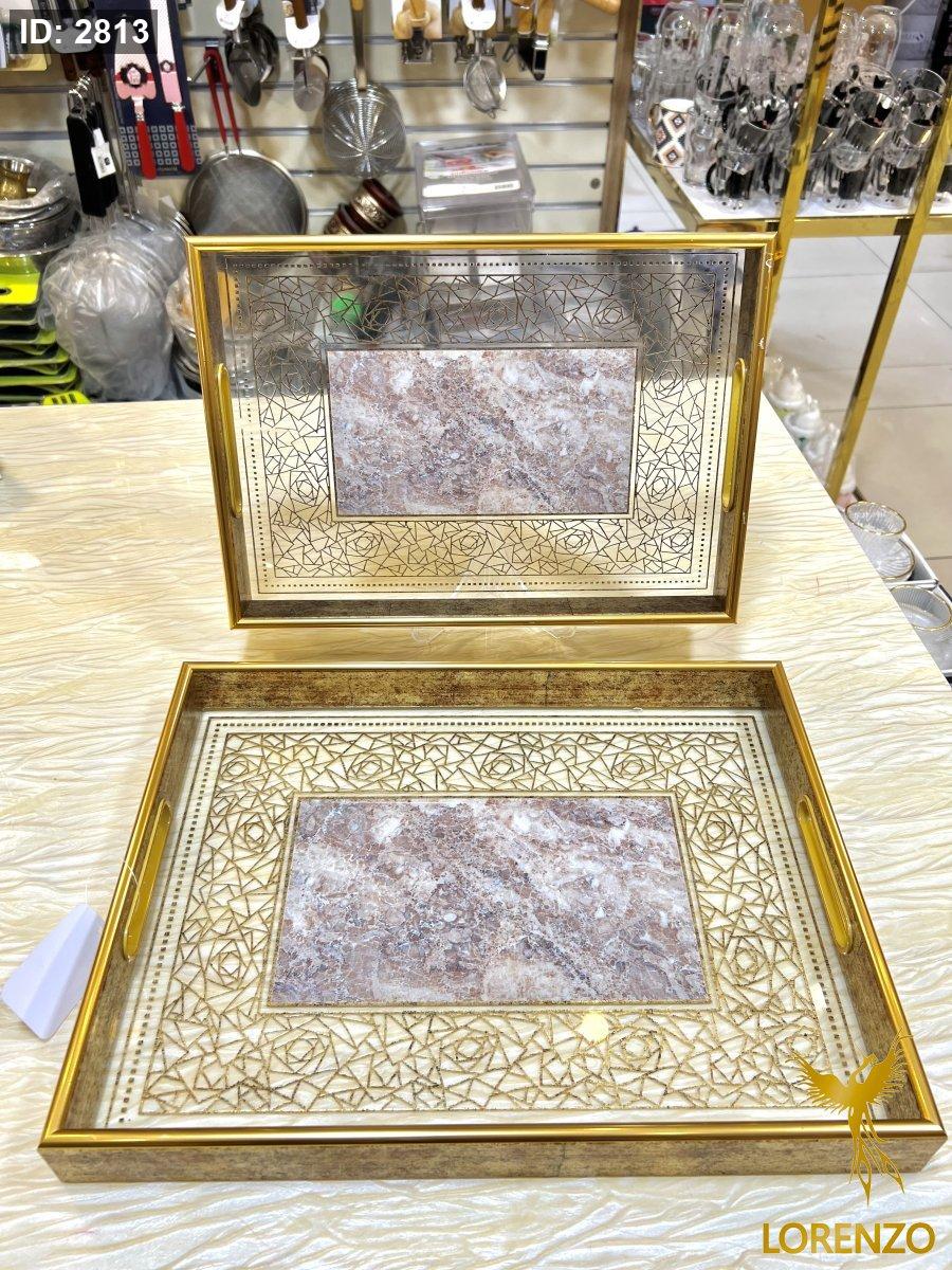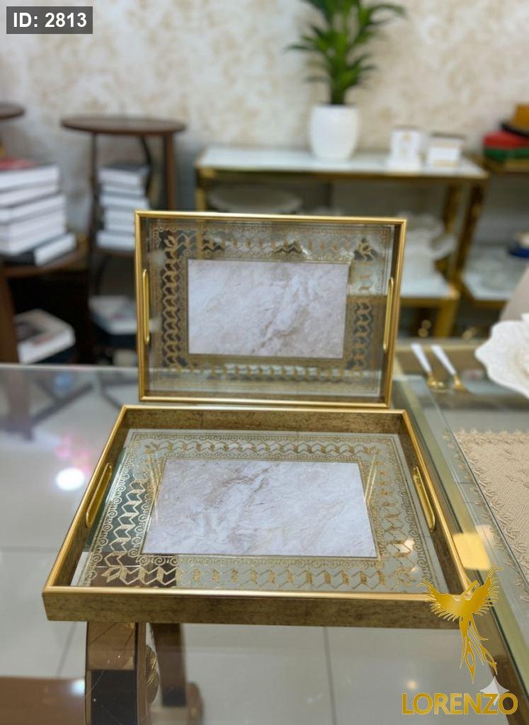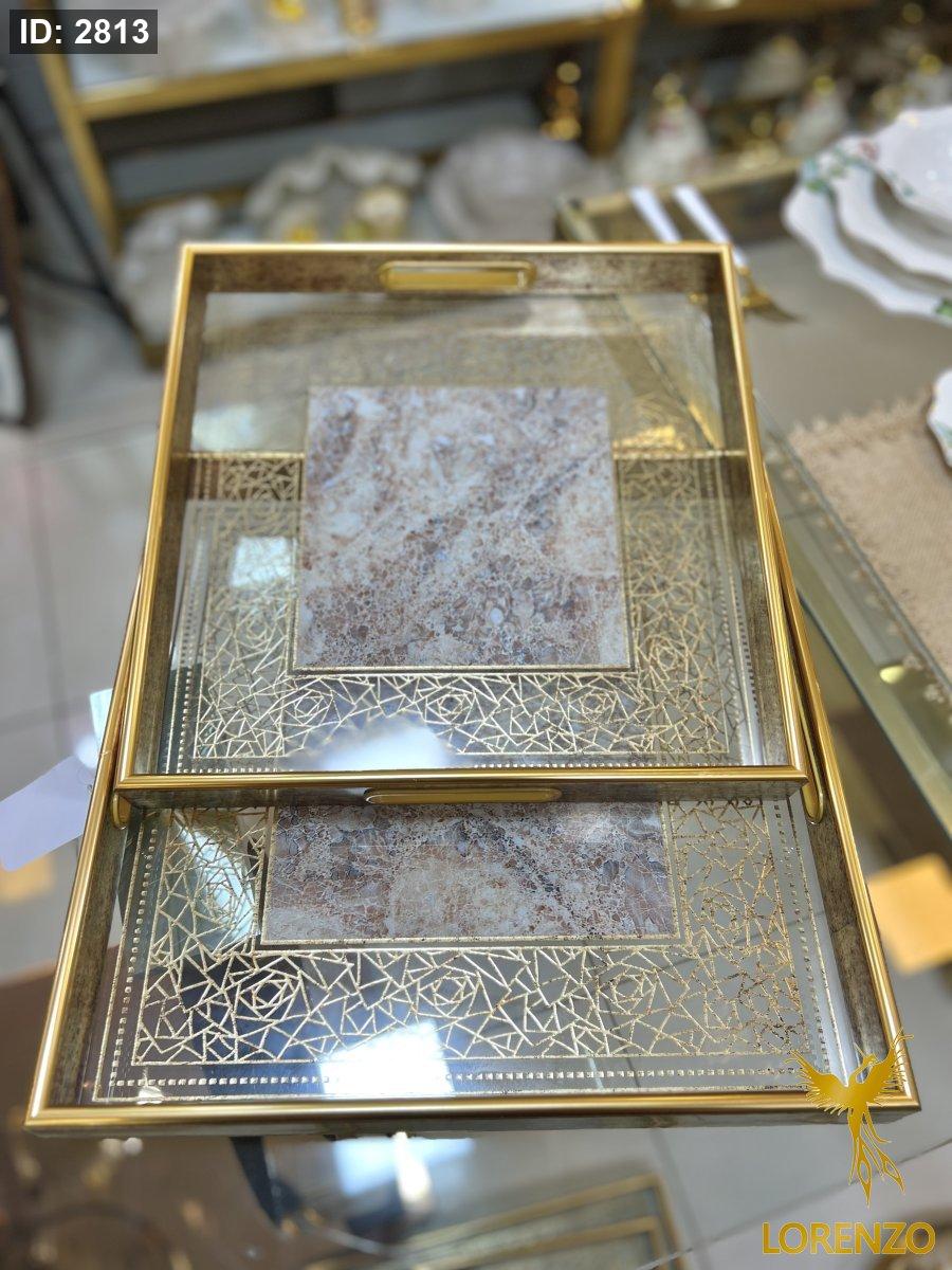 الإطار ذهبي، والقاعدة مزيج من الزجاج والرخام بنقشة فنية فخمة
