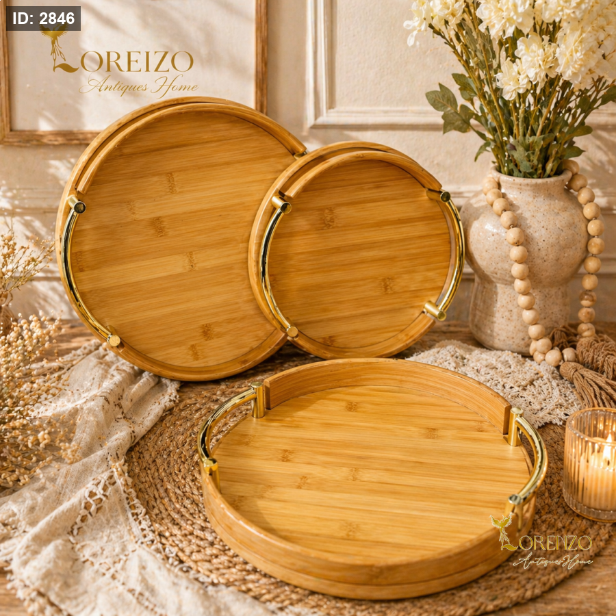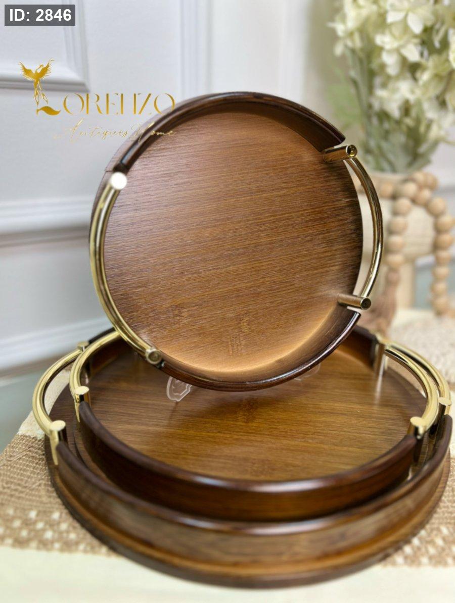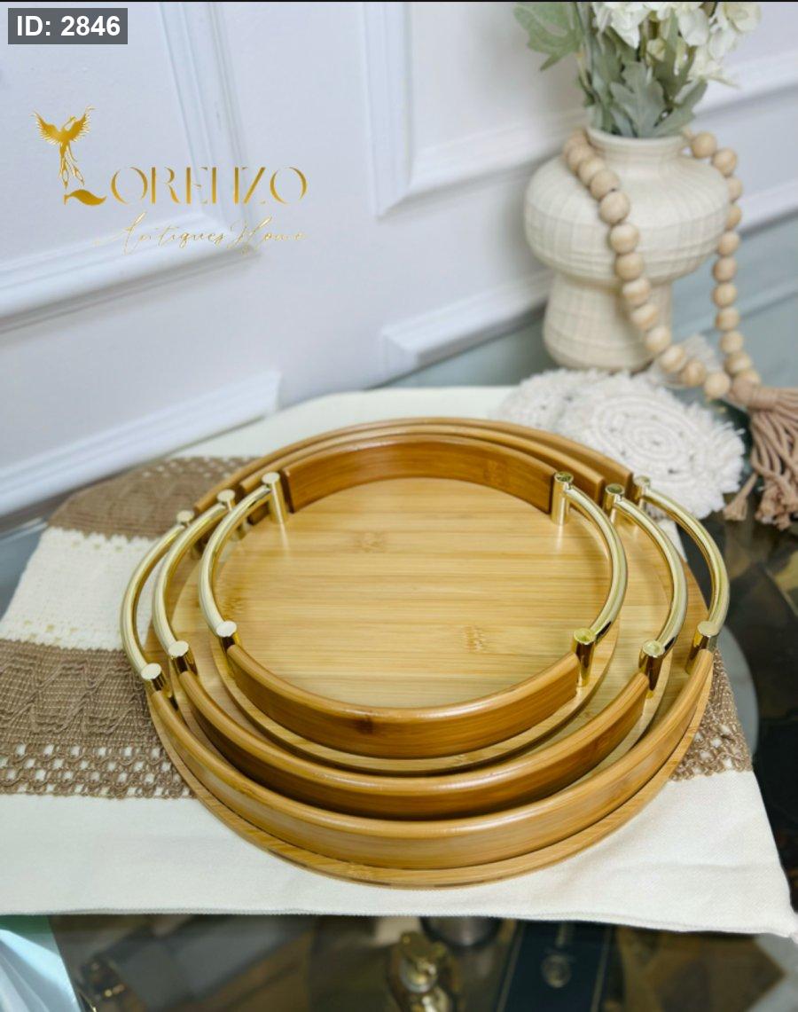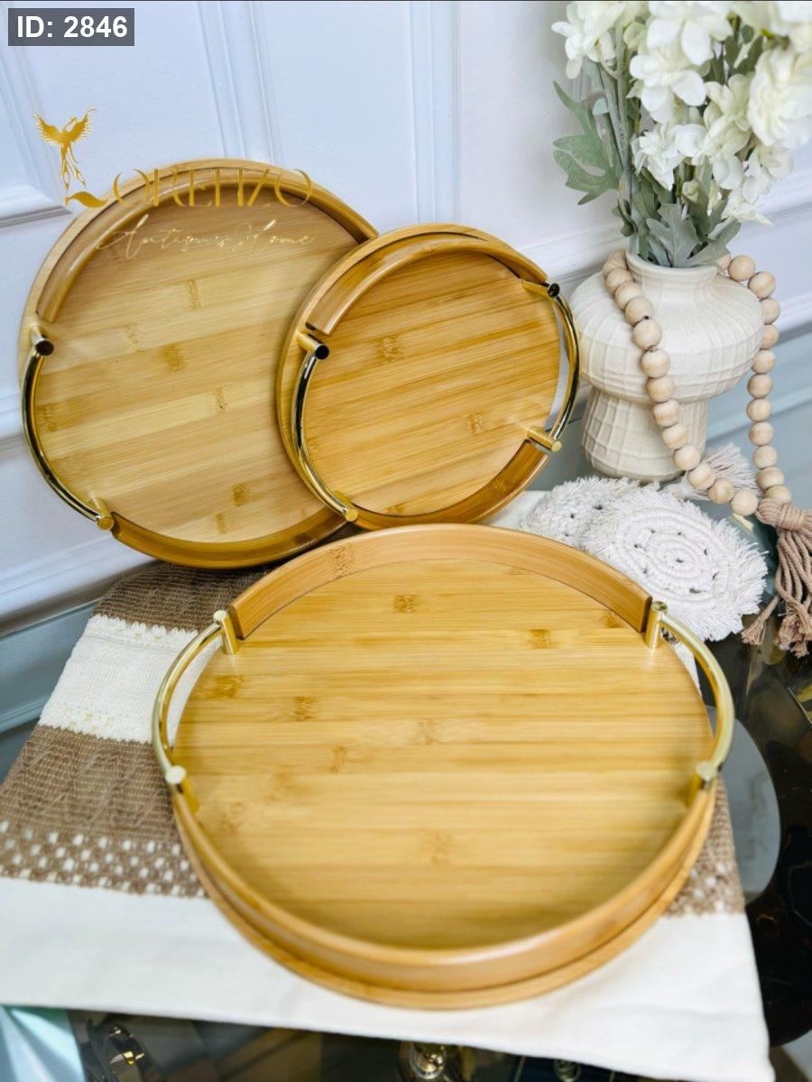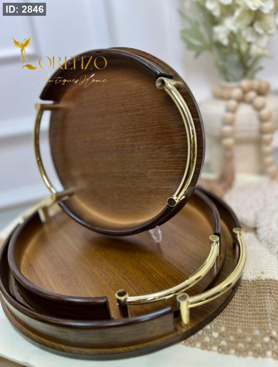 صواني خشبية بالشكل الدائري بمقابض ذهبية 3 قطع