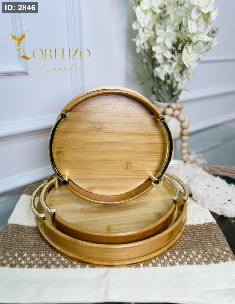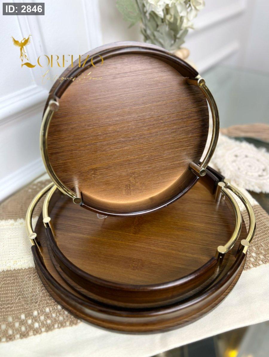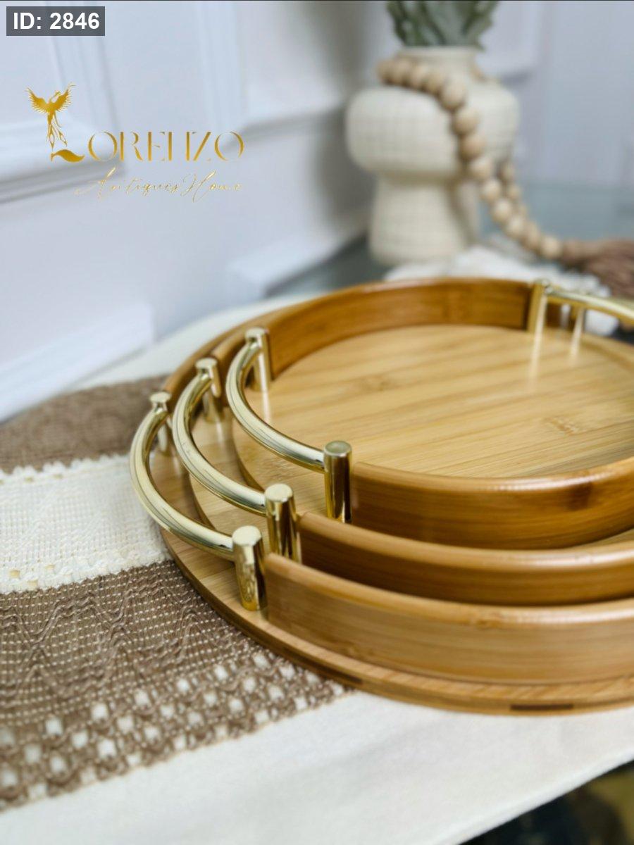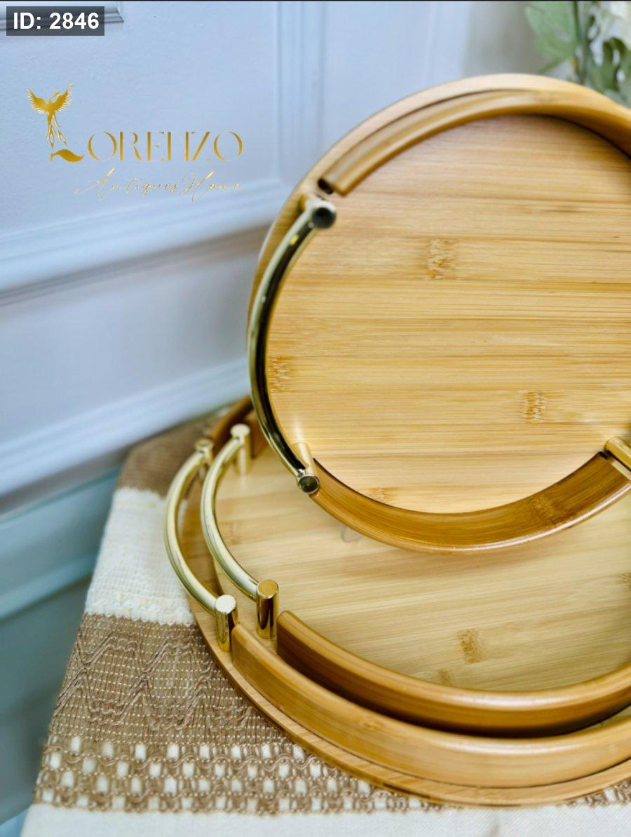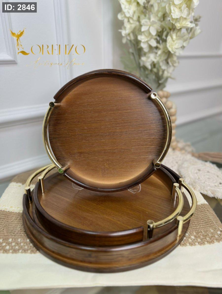 صواني خشبية بالشكل الدائري بمقابض ذهبية 3 قطع