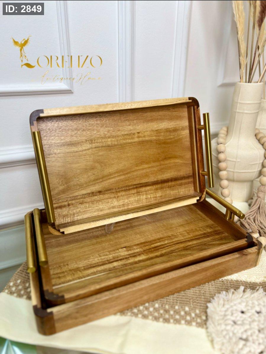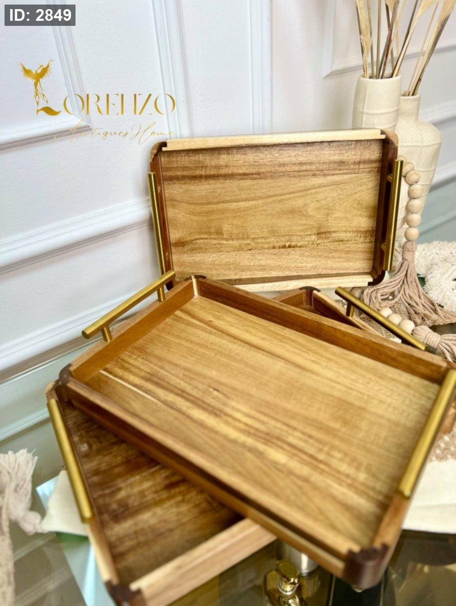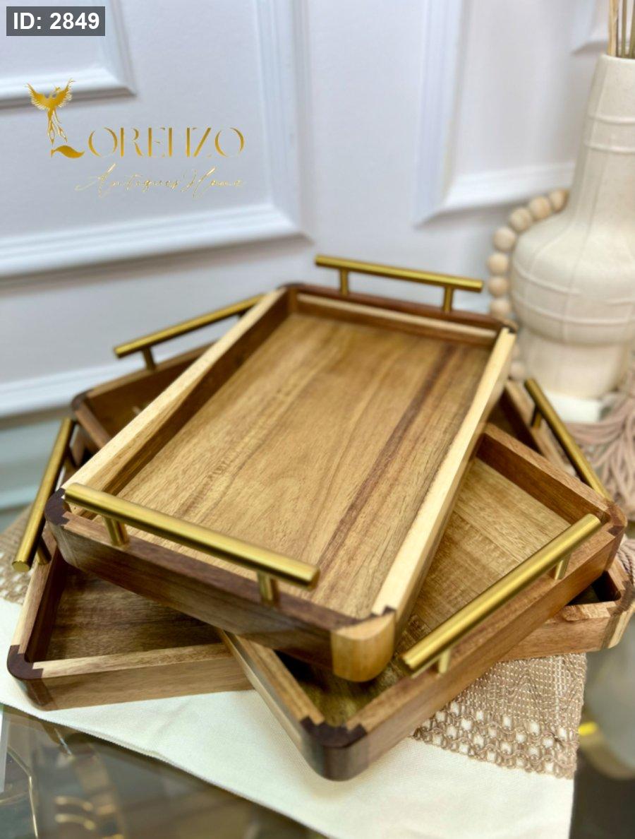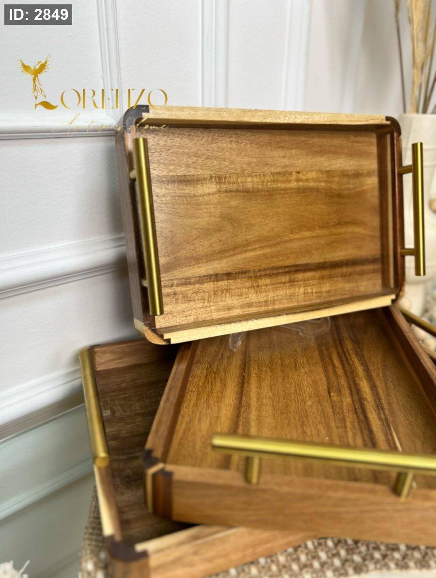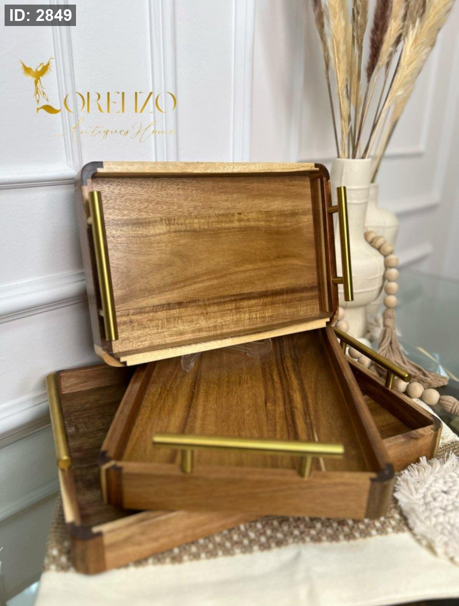 صواني خشب طبيعي مع مقابض معدن ذهبية 3 قطع