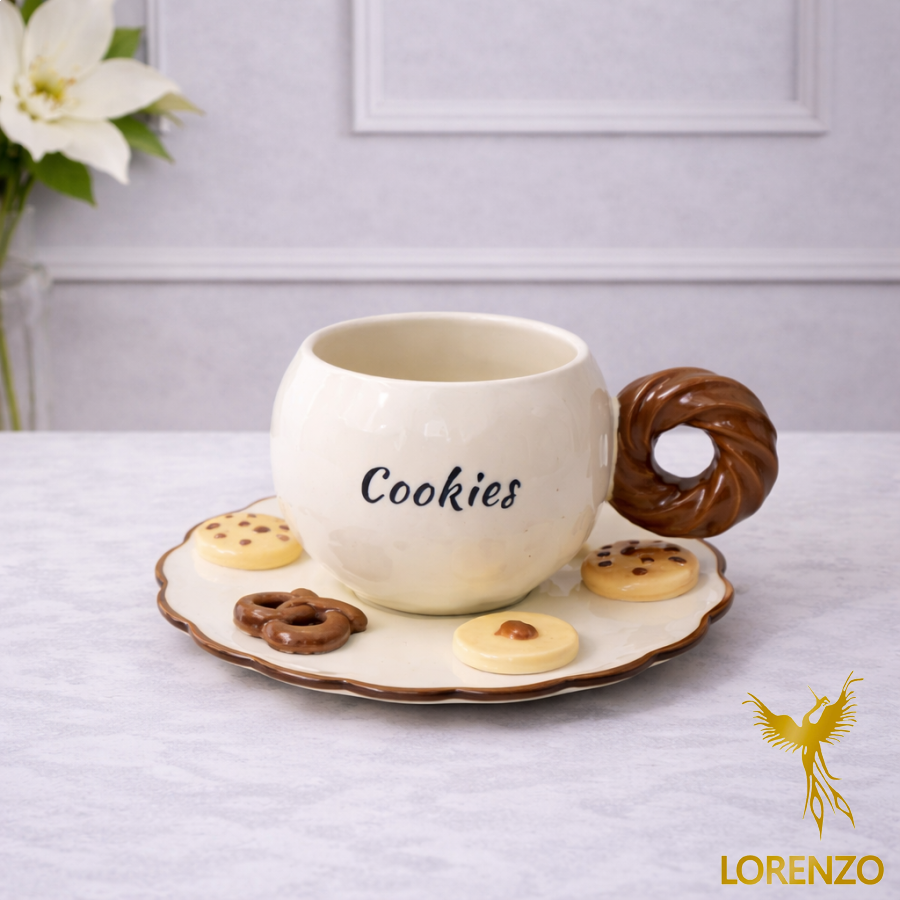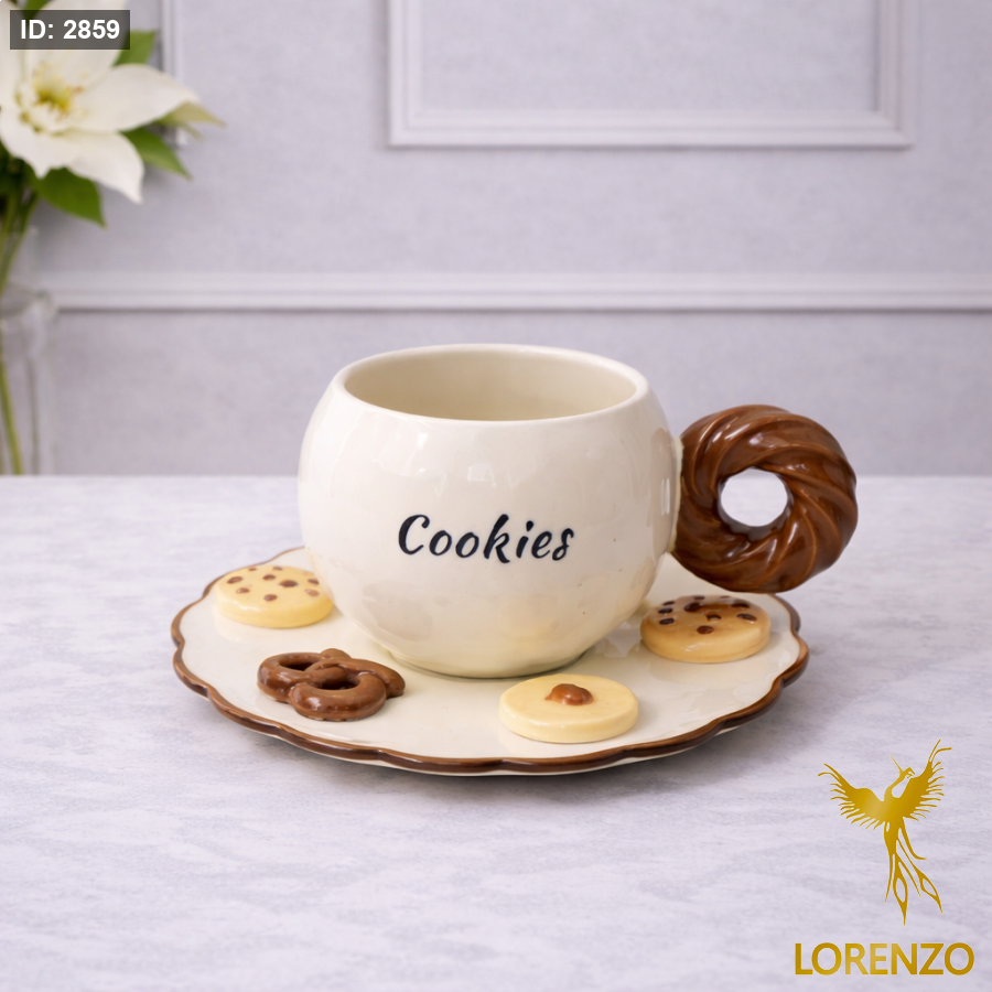 مج سيراميك بتصميم مميز مستوحى من عالم الكوكيز والحلويات، يتميز بلون كريمي أنيق مع كلمة Cookies على الواجهة، ومقبض بني بتصميم دائري يشبه الدونات/البسكويت يضفي لمسة مرحة ودافئة. يأتي مع صحن سيراميك متناسق مزين بتفاصيل كوكيز صغيرة تضيف جمالًا خاصًا لتجربة التقديم.