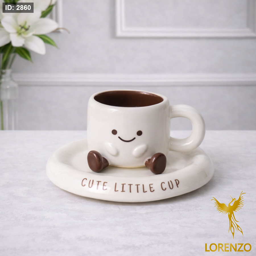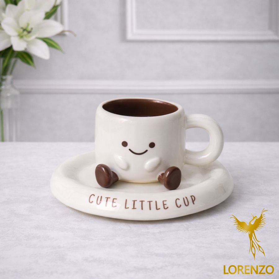 مج سيراميك بتصميم لطيف مستوحى من شكل المارشميلو، يتميز بوجه مبتسم ناعم مع أقدام صغيرة بارزة تضفي عليه طابعًا مرحًا ومحببًا. يأتي مع صحن سيراميك متناسق يحمل عبارة لطيفة، ليشكل قطعة متكاملة تضيف أجواء دافئة ومميزة إلى طاولة التقديم.