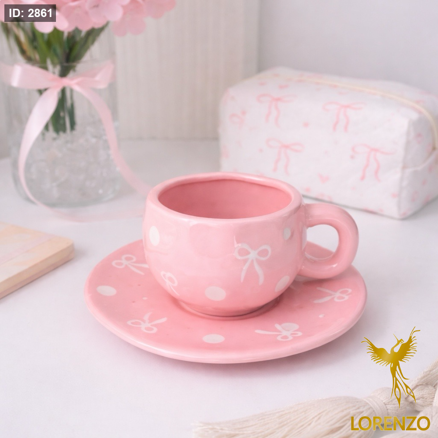 مج سيراميك مع صحن – تصميم ربطة ببيونة وردية