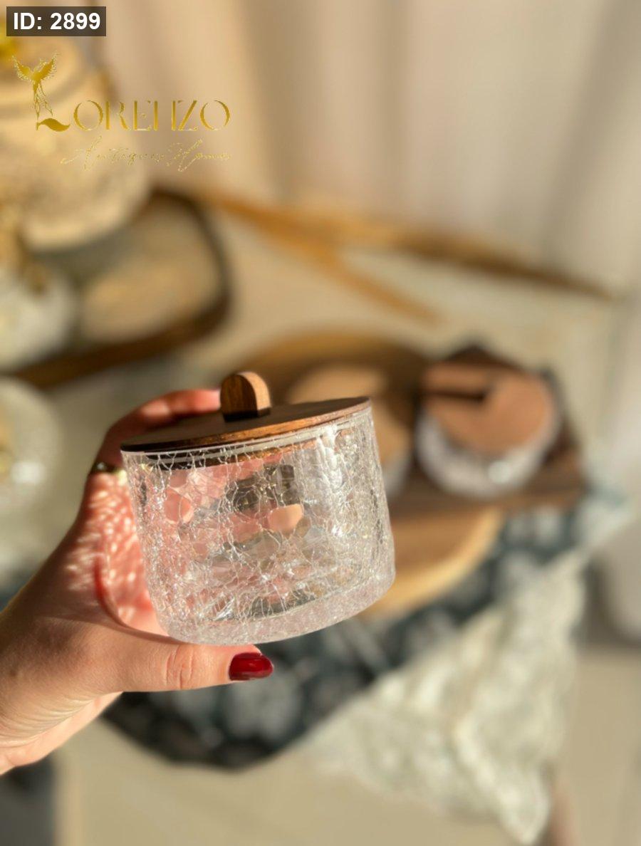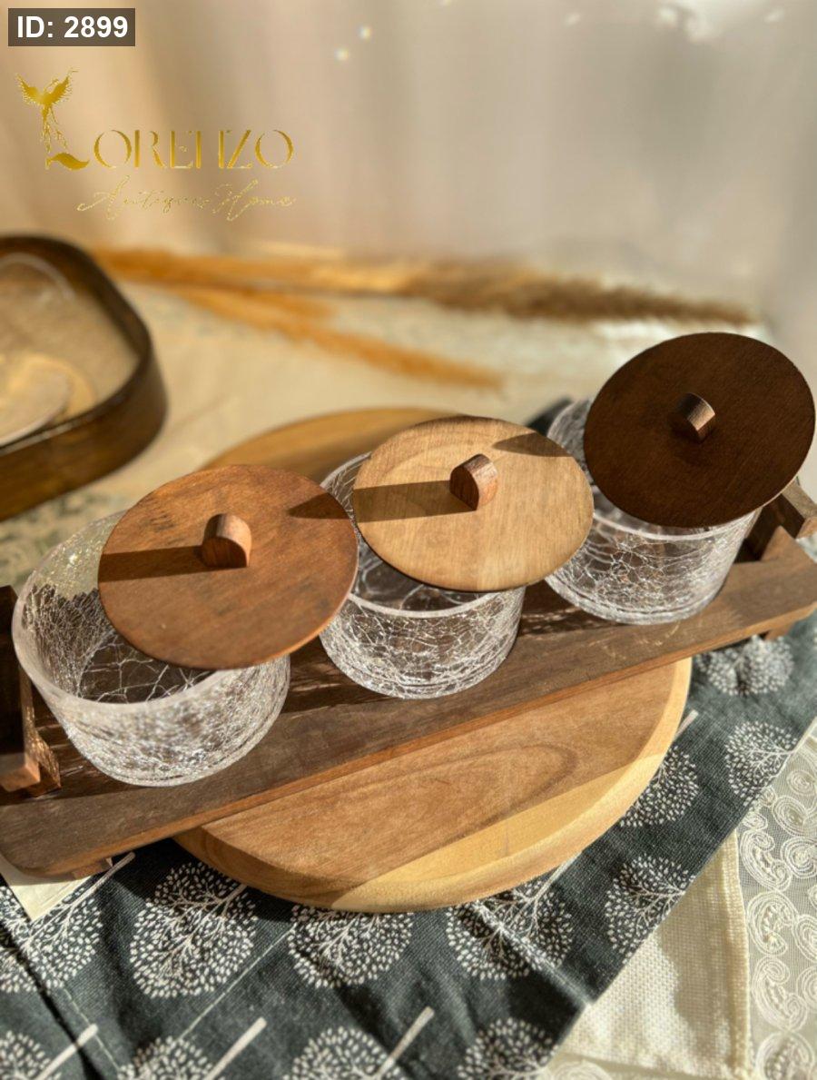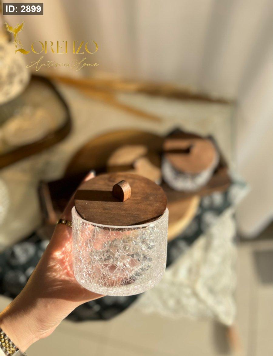 مضيفة زجاج مُتلئلئ مع قاعدة خشب ثلاثية ( مع غطاء)