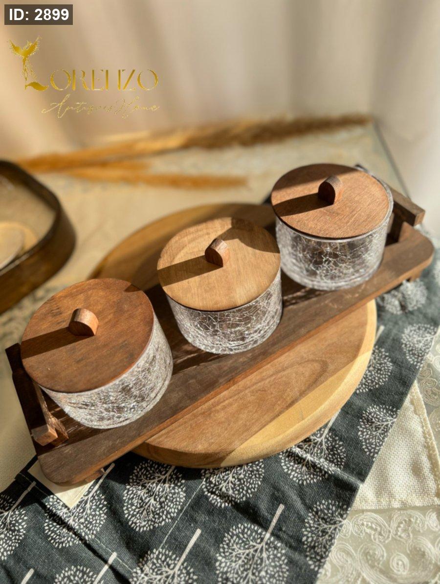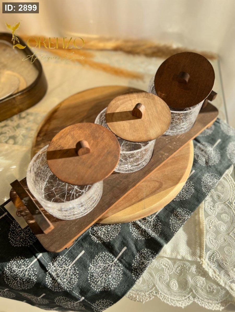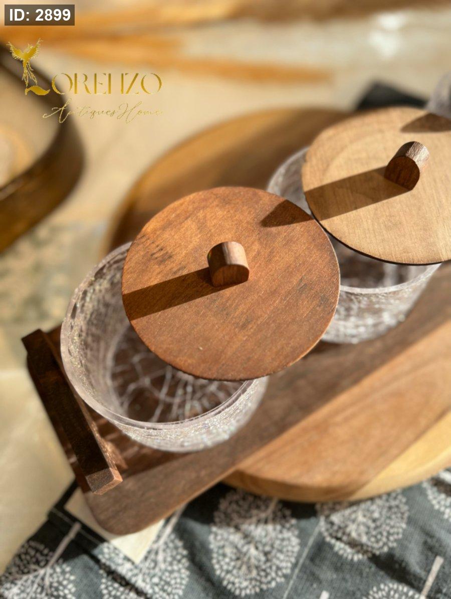 مضيفة زجاج مُتلئلئ مع قاعدة خشب ثلاثية ( مع غطاء)