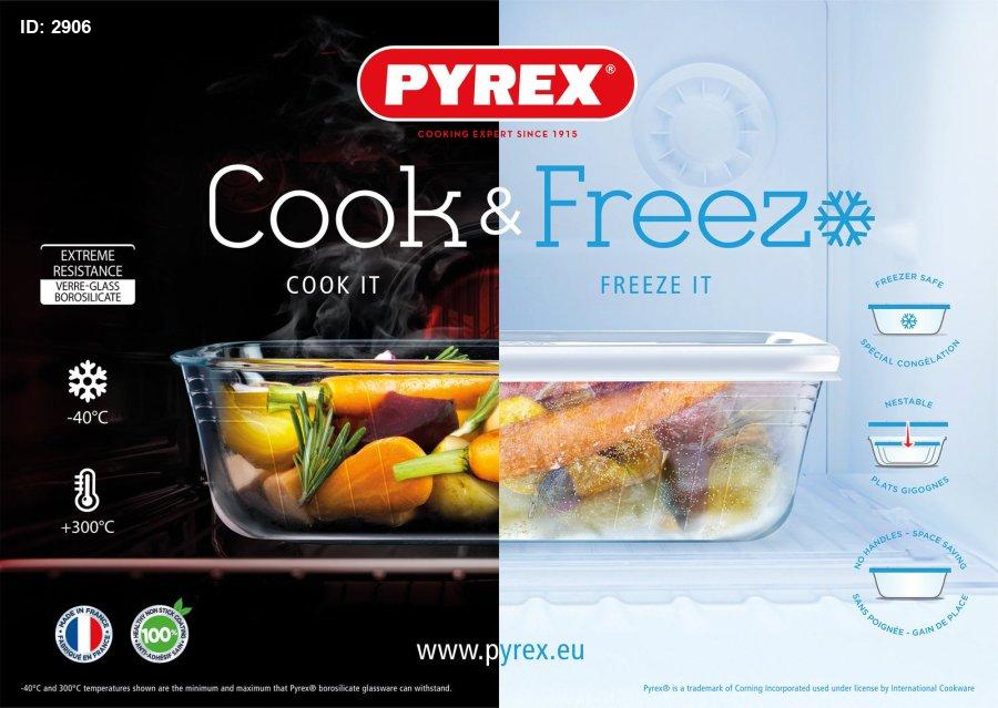 وعاء عملي مصنوع من زجاج Pyrex عالي الجودة، مصمم للطهي، التخزين، والتجميد بسهولة وأمان. السعة المتوسطة مثالية للوجبات اليومية وتحضير الطعام مسبقًا، مع تصميم مستطيل يساعد على ترتيب أفضل داخل الثلاجة والفريزر.