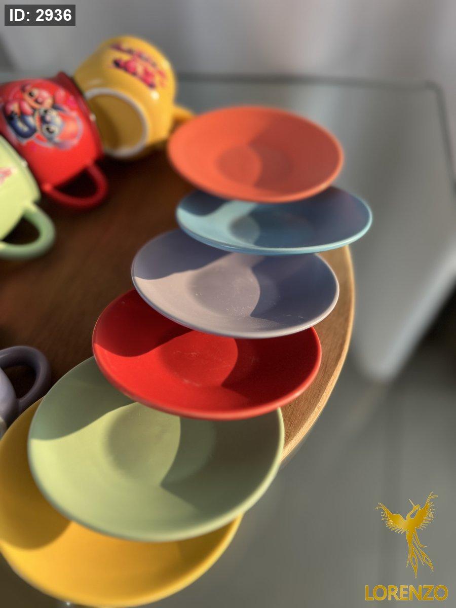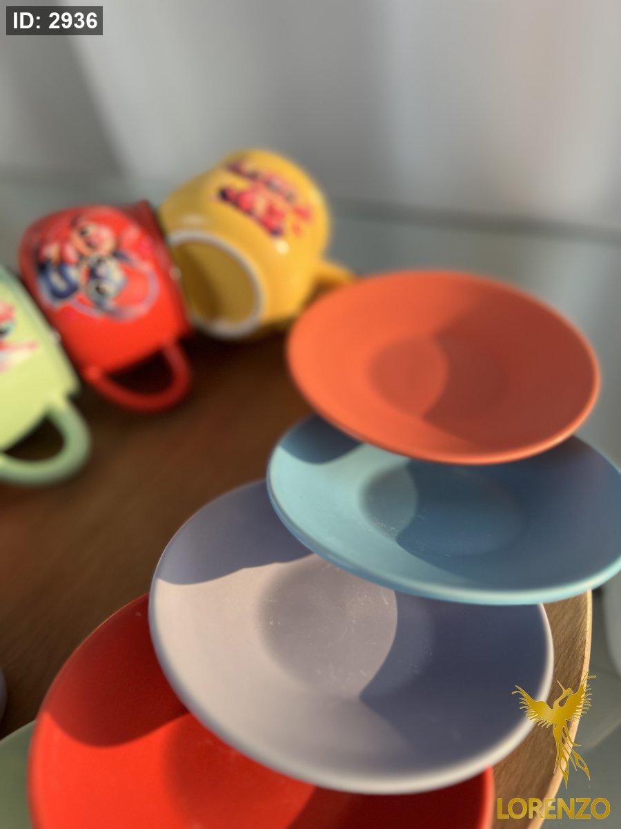 المحتويات: تتضمن المجموعة أكوابًا وصحونًا بألوان متعددة (بنفسجي، أحمر، تركواز، أخضر فاتح، برتقالي، أصفر).