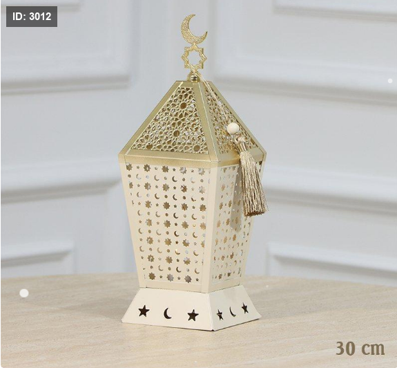 فانوس رمضان مضلع 30 سم تنك بيج وذهبي اضاءة ذهبي بطاريات