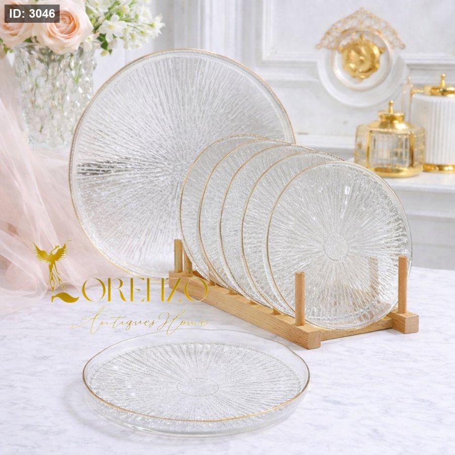 طقم تقديم أنيق بتصميم راقٍ يضفي لمسة فخامة على طاولة الضيافة. مصنوع من زجاج شفاف عالي الجودة بنقشة دائرية متناسقة تعكس الضوء بأسلوب جذاب، مع حواف ذهبية دقيقة تضيف إحساسًا بالرقي والتميز. يأتي الطقم مع ستاند خشبي أنيق لتنظيم الصحون وعرضها بشكل جميل وعملي.