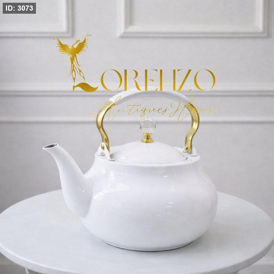 إبريق شاي أنيق بتصميم كلاسيكي راقٍ، مصنوع بعناية ليجمع بين الجمال والعملية. يأتي بلون أبيض ناصع مع مقبض معدني بلون ذهبي فاتح ولمسة فاخرة من الكرستال على الغطاء، ليكون قطعة مميزة تضيف أناقة خاصة لطاولة التقديم.