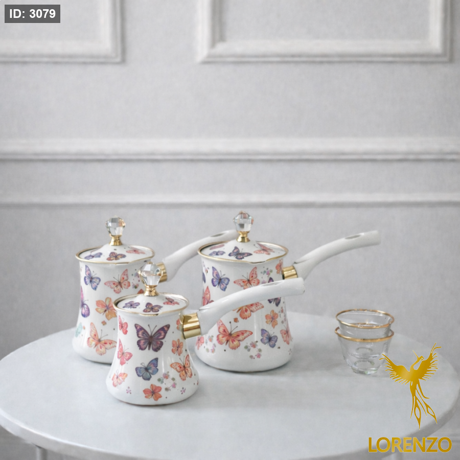 طقم غلايات قهوة تركية بنقشة الفراشات – 3 أحجام