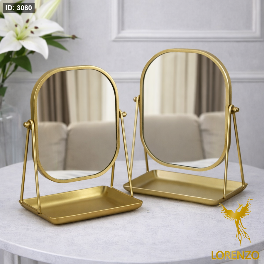 مرآة طاولة أنيقة بتصميم عصري راقٍ، مصنوعة من هيكل معدني متين بلمسة ذهبية فاخرة، مناسبة لطاولة التسريحة أو غرفة النوم. تتميز بثبات ممتاز وقاعدة عملية يمكن استخدامها لوضع الإكسسوارات الصغيرة أو أدوات المكياج، مع إمكانية تعديل زاوية الميل لراحة الاستخدام.