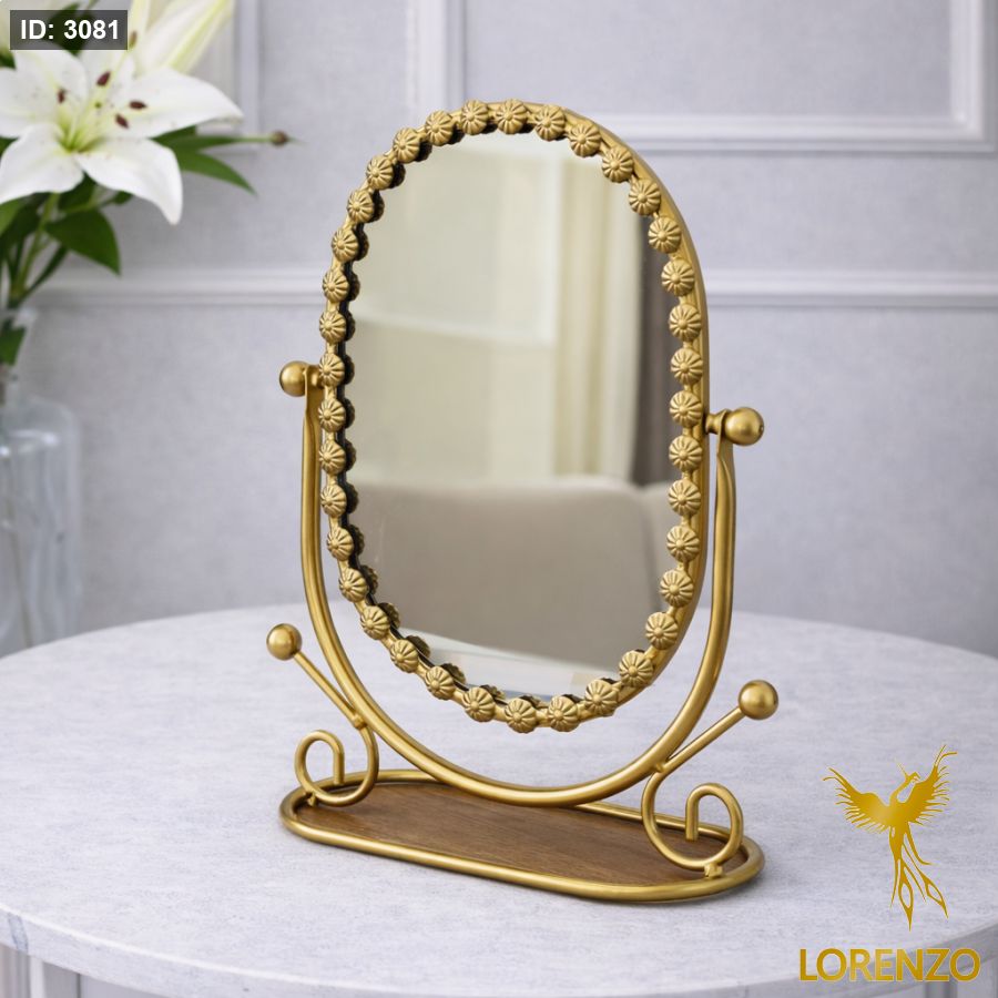 مرآة طاولة أنيقة بتصميم كلاسيكي فاخر، تتميز بإطار معدني مزخرف بنقوش دقيقة تضفي لمسة فخامة ورقي على طاولة التسريحة أو غرفة النوم. تجمع بين الجمال العملي والثبات العالي، مع إمكانية تعديل زاوية الميل لسهولة الاستخدام اليومي.