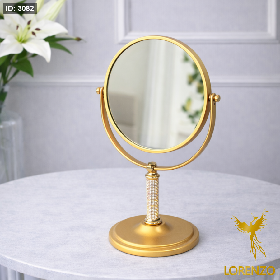 مرآة طاولة بتصميم عصري أنيق، مصنوعة من معدن متين بلمسة ذهبية جذابة، مع قاعدة مزينة بتفاصيل كريستالية تضيف فخامة واضحة للمكان. قطعة عملية وديكورية في آنٍ واحد.