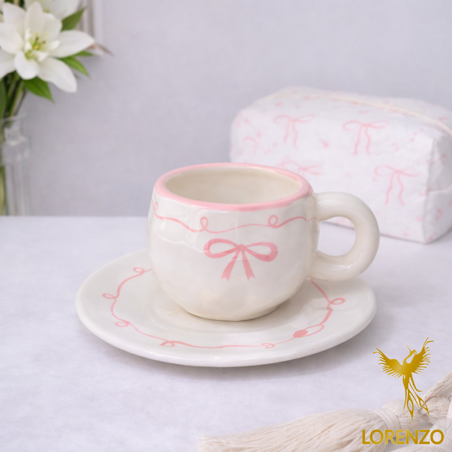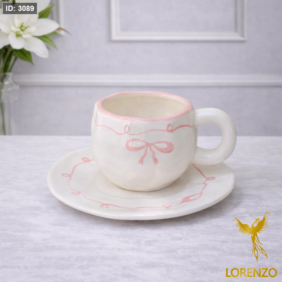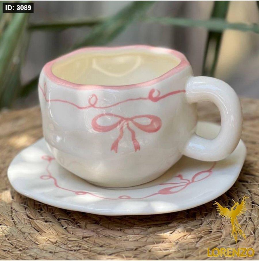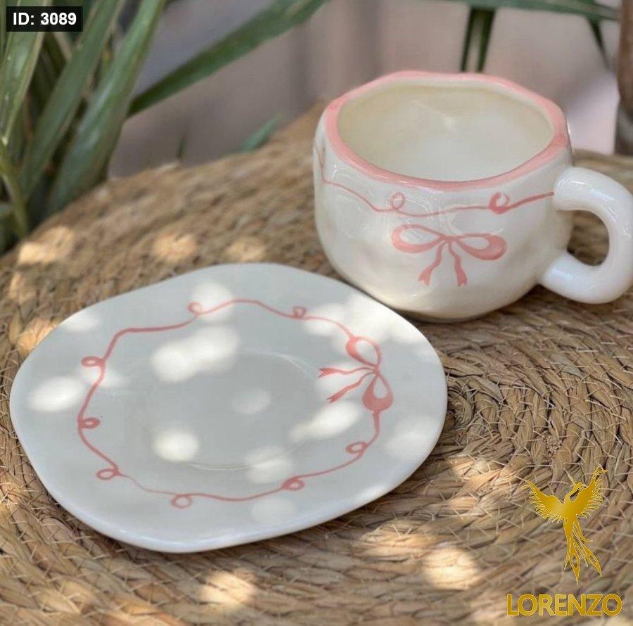 مج سيراميك مع صحن – تصميم ربطة ببيونة وردية منقطة