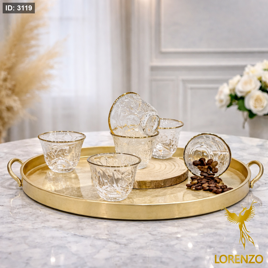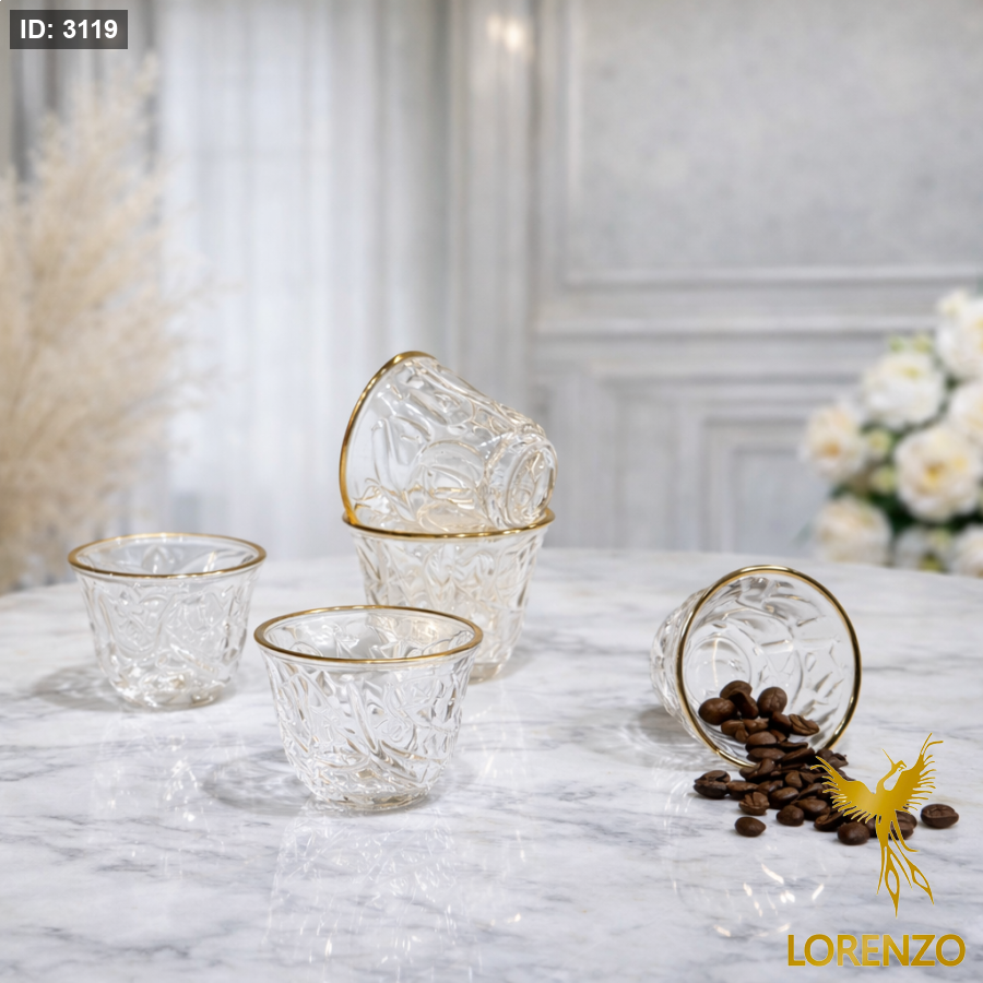 طقم فناجين قهوة زجاجية سادة محفرة بتصميم راقٍ يجمع بين البساطة والفخامة، مناسب للاستخدام اليومي في المكاتب أو لتقديم القهوة للضيوف بأسلوب أنيق ومرتب.
