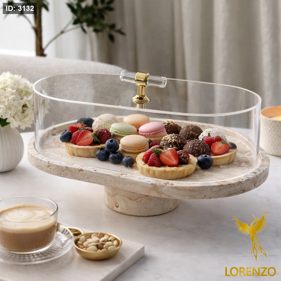لأن تفاصيل الضيافة تعكس ذوقك، يأتي هذا الستاند بتصميم فاخر يجمع بين الأناقة العملية والفخامة الهادئة. قاعدة حجرية راقية تبرز جمال التقديم، مع غطاء أكريليك شفاف ومقبض ذهبي يمنح القطعة حضورًا أنيقًا ولافتًا على الطاولة.