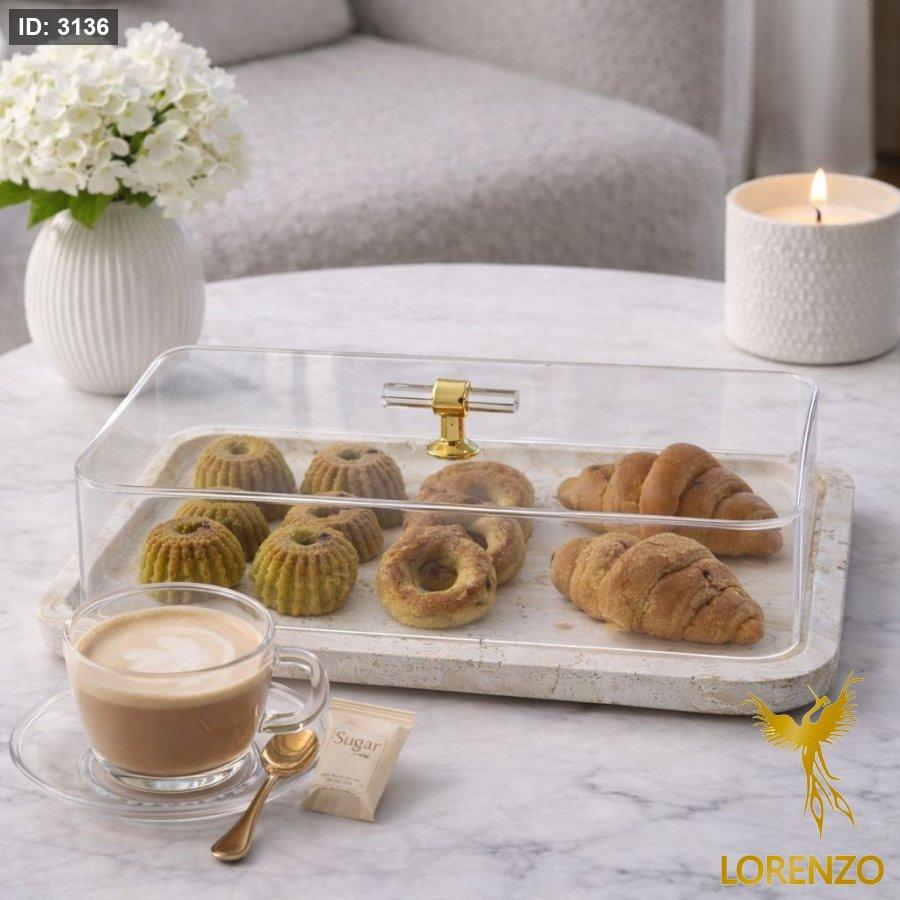 لأن تفاصيل الضيافة تعكس ذوقك، يأتي هذا الستاند بتصميم فاخر يجمع بين الأناقة العملية والفخامة الهادئة. قاعدة حجرية راقية تبرز جمال التقديم، مع غطاء أكريليك شفاف ومقبض ذهبي يمنح القطعة حضورًا أنيقًا ولافتًا على الطاولة.