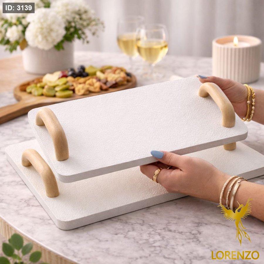 طقم صواني تقديم بسطح أبيض مزخرف ومقابض خشبية أنيقة