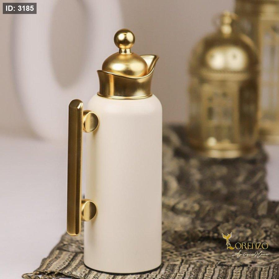 دلة تقديم بتصميم عصري ناعم، تجمع بين اللون الأبيض الهادئ والمقبض والغطاء باللون الذهبي، لتمنح طاولة الضيافة لمسة فخامة وهدوء. مثالية لأجواء الضيافة الرمضانية والمناسبات الخاصة، وتنسجم بشكل جميل مع الديكورات الدافئة والإضاءة الناعمة.