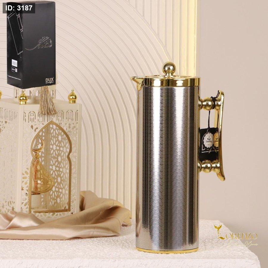 دلة تقديم راقية مصنوعة من الستانلس ستيل عالي الجودة، بتصميم عصري يجمع بين اللون الفضي اللامع والنقشة الأنيقة مع لمسات ذهبية فخمة في الغطاء والمقبض. تمنح طاولة الضيافة حضورًا مميزًا وتناسب الاستخدام اليومي والمناسبات الخاصة.