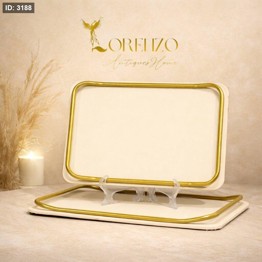 طقم صواني /2 مستطيل اطار تنك ذهبي وجه جلد كريمي بيدين لف