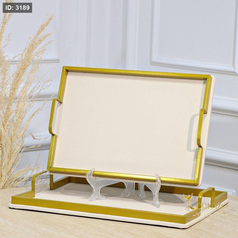 طقم صواني /2 مستطيل اطار تنك ذهبي وجه جلد بيج بيدين مستطيل