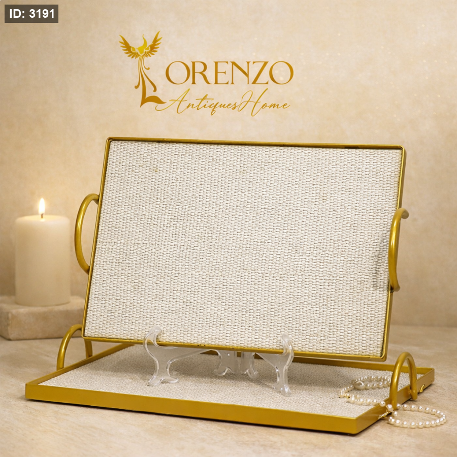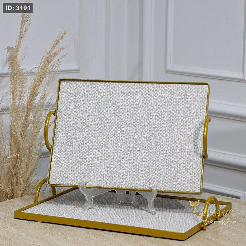 طقم صواني /2 مستطيل اطار تنك ذهبي وجه قماش ابيض وسكني بيدين مقبض