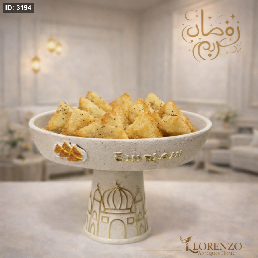 مصنوعة من الريزن عالي الجودة بلون أوف وايت راقٍ، مع تفاصيل وزخارف ذهبية تضفي طابعًا شرقيًا مميزًا. تأتي على قاعدة مرتفعة لعرض السمبوسة أو المعجنات بطريقة جذابة ومنظمة، مما يجعلها قطعة مثالية للضيافة والديكور في آنٍ واحد.