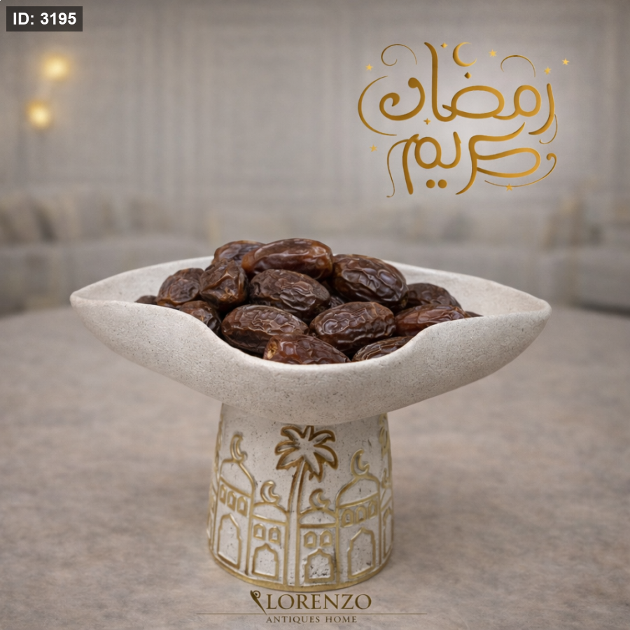 مصنوعة من الريزن عالي الجودة بملمس حجري راقٍ ولون أوف وايت هادئ، مع نقوش ذهبية دقيقة تعكس جمال التفاصيل الشرقية. تأتي على قاعدة مرتفعة تمنح التمر حضورًا أنيقًا وتسهّل التقديم أثناء الإفطار والسحور.