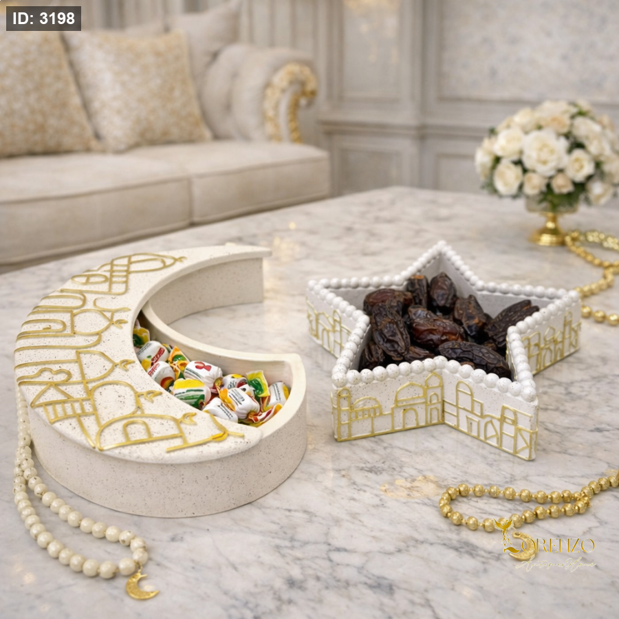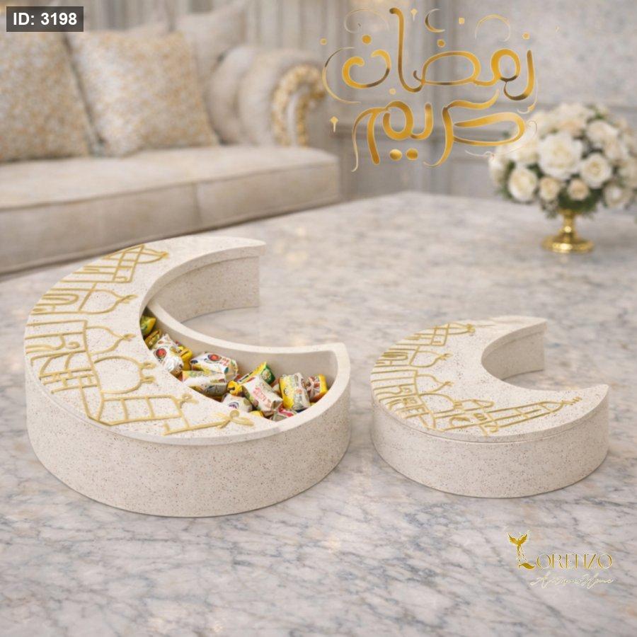 صحن ضيافة بتصميم هلال رمضاني أنيق، مزخرف بنقوش إسلامية ذهبية تضيف لمسة فخامة وهدوء لطاولة الضيافة. قطعة مميزة تناسب أجواء رمضان والمناسبات الخاصة.