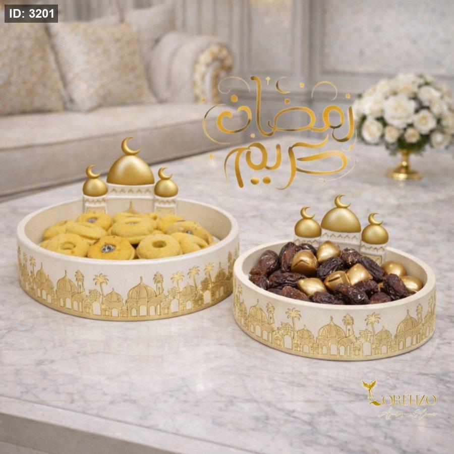 يتميّز الطقم بتصميم عملي وجمالي في آنٍ واحد، مناسب لتقديم التمر، الحلويات، الشوكولاتة أو المكسرات، مما يجعله خيارًا مثاليًا لضيافة رمضان والمناسبات الخاصة والجلسات العائلية.