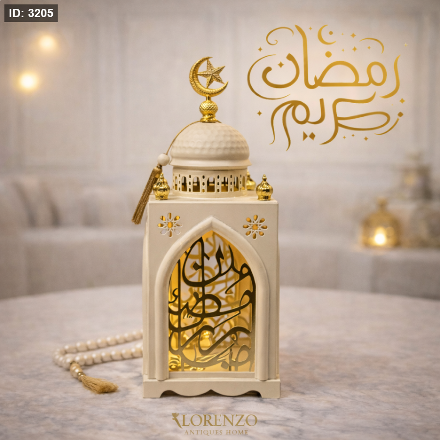 فانوس رمضاني أنيق بتصميم إسلامي مميز، يجمع بين اللون الكريمي الهادئ والتفاصيل الذهبية الراقية ليمنح طاولتك أو زاوية الضيافة لمسة رمضانية دافئة وفاخرة. يتميز بنقوش عربية وزخارف هندسية مستوحاة من العمارة الإسلامية، مع هلال ذهبي أعلى القبة يضفي طابعًا روحانيًا أنيقًا.