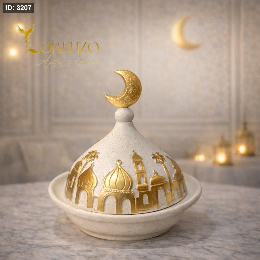 مضيفة أنيقة مستوحاة من الأجواء الرمضانية الكلاسيكية، بتصميم هلال راقٍ يجمع بين اللون الكريمي الهادئ والتفاصيل الذهبية الفاخرة. مثالية لتقديم التمر أو الشوكولاتة بأسلوب راقٍ يعكس الذوق الرفيع ويضيف لمسة دافئة على طاولة الضيافة.