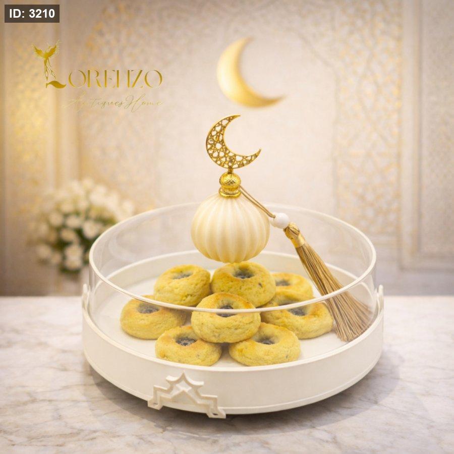 صحن ضيافة رمضاني بتصميم راقٍ يجمع بين البساطة والفخامة، مزوّد بغطاء شفاف أنيق يحافظ على المحتوى ويبرز جمال التقديم. يتوسطه مقبض ديكوري مميز على شكل هلال ذهبي مزخرف مع شرّابة أنيقة تضيف لمسة رمضانية فاخرة.