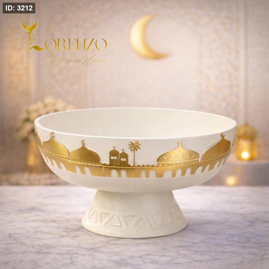 وعاء تقديم أنيق مصنوع بتصميم راقٍ باللون الأبيض مع زخارف ذهبية مستوحاة من الطابع الرمضاني والمعماري الشرقي. يتميز بقاعدة ثابتة تمنحه ارتفاعًا أنيقًا على الطاولة، ما يجعله مثاليًا لتقديم الحلويات، الفواكه، التمور، أو الضيافة في المناسبات الخاصة وشهر رمضان المبارك.
