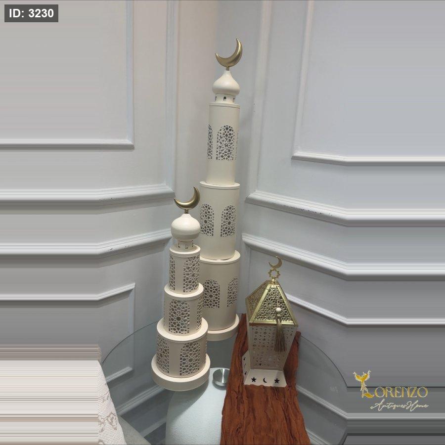 أضيفي لمسة روحانية راقية لديكور منزلك مع هذا الطقم المميز من فوانيس رمضان المصممة على شكل مآذن إسلامية. تصميم أنيق يجمع بين اللون الكريمي الهادئ والتفاصيل الذهبية اللامعة، مع زخارف هندسية مستوحاة من الطراز الإسلامي الكلاسيكي.