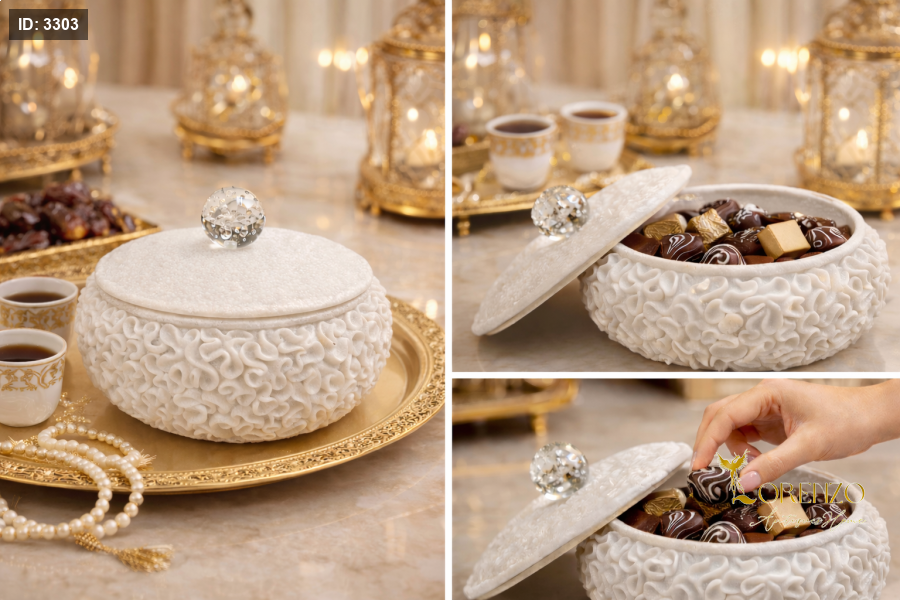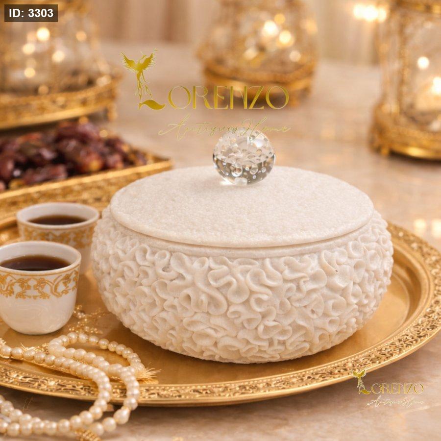 قطعة ضيافة فخمة بحجم أكبر لتقديم الشوكولاته أو التمر أو الحلويات بشكل أنيق، تتميز بنقشة ريزن غنية تعكس الفخامة، مع غطاء مزوّد بقبضة كرستالية تضيف لمسة راقية ومميزة.