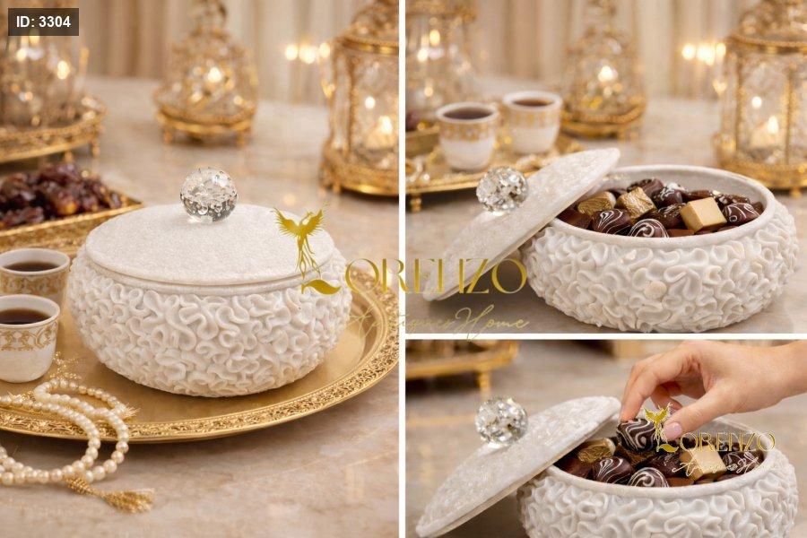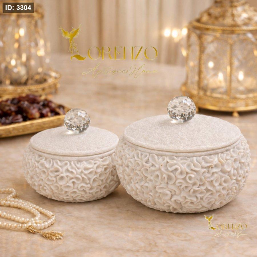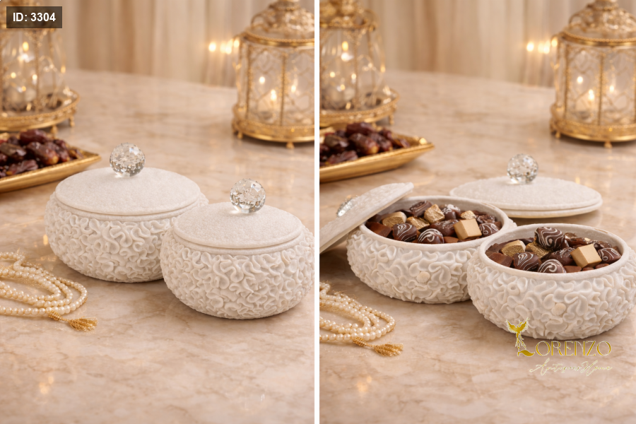 قطعة ضيافة أنيقة تضيف لمسة فخامة لأي طاولة استقبال، مصنوعة من ريزن عالي الجودة بملمس زخرفي مميز، مع غطاء أنيق مزوّد بقبضة كرستالية لامعة تمنحها حضوراً راقياً.