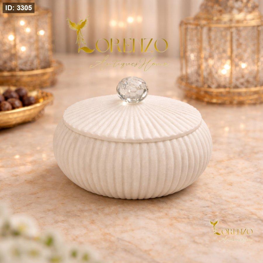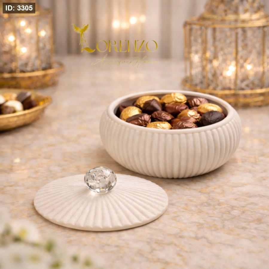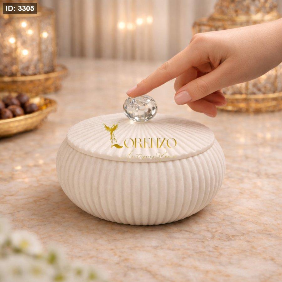 قطعة ضيافة أنيقة بتصميم مخطط فاخر تضيف لمسة راقية لطاولة القهوة أو الضيافة، مصنوعة من ريزن عالي الجودة بملمس ناعم مع غطاء مزوّد بقبضة كرستالية لامعة تمنحها حضوراً مميزاً.