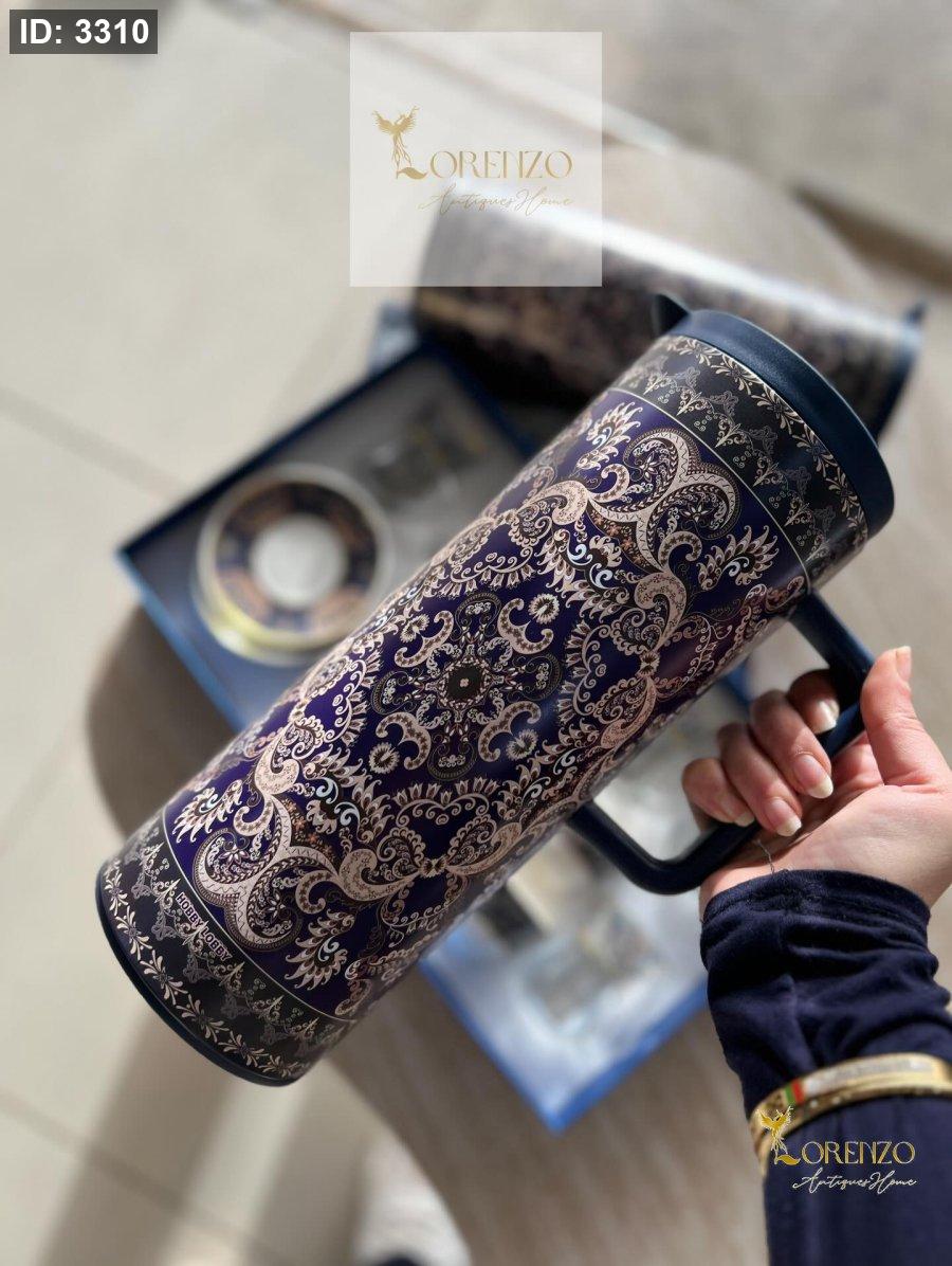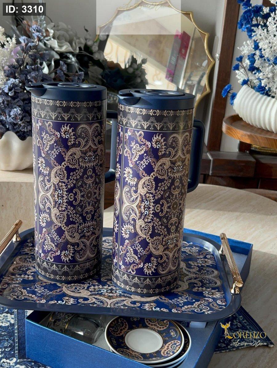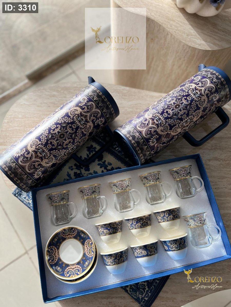 طقم تيرموس شاي و قهوة فاخر مع صينية مزخرفة – 6 كاسات شاي + 6 صحون + 6 فناجين قهوة