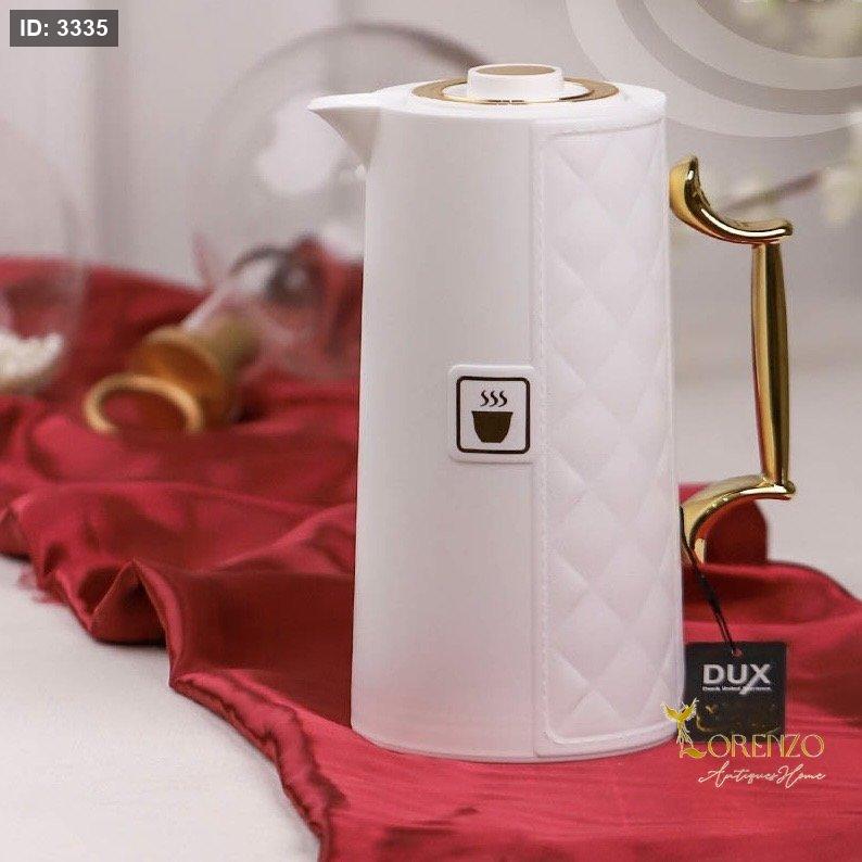 ترمس حراري فاخر بتصميم أنيق وعصري، بلون أبيض راقٍ مع يد ذهبية لامعة تضيف لمسة فخامة مميزة على طاولة الضيافة 🌟