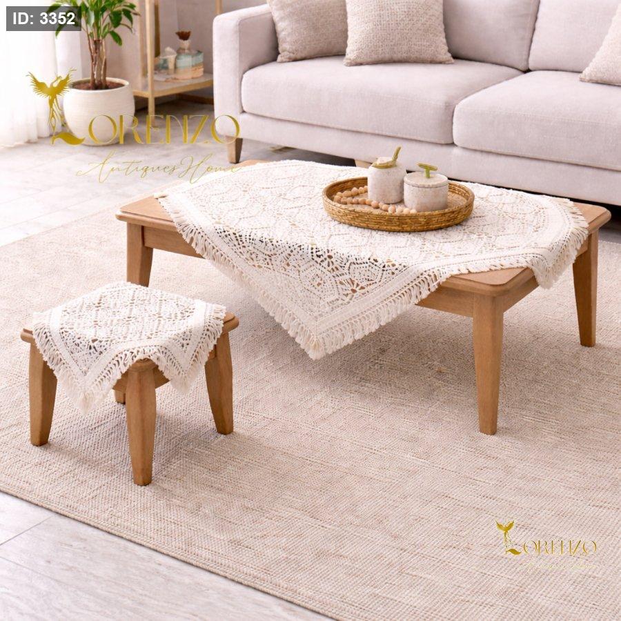امنحي طاولة الضيافة لمسة فخامة ودفء مع طقم شرشف الطاولة المربع المصنوع بتقنية الكروشيه اليدوي، والمرفق بأربع سكملات متناسقة تضيف تناغماً أنيقاً لجلسة الصالون أو غرفة المعيشة. يتميز الطقم بنقشة زخرفية دقيقة وشراشيب ناعمة تعكس الطابع الكلاسيكي الراقي مع لمسة عصرية تناسب مختلف أنماط الديكور.