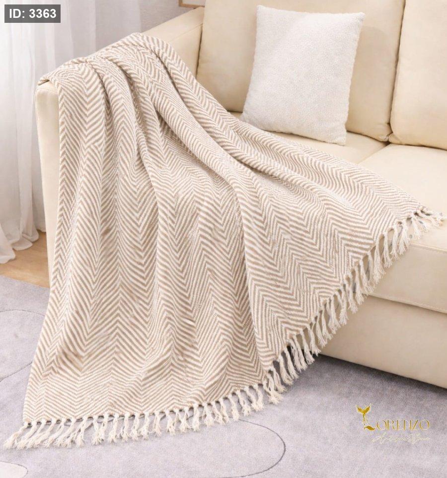 بطانية بتصميم متعرج (زيك زاك) بلون بيج مع أوف وايت، تمنح إحساس بالحيوية مع الحفاظ على الطابع الهادئ. قماشها مريح وعملي للاستخدام اليومي، وتفاصيل الشرّابات الجانبية تضيف لمسة ديكور مميزة تناسب الجلسات العصرية