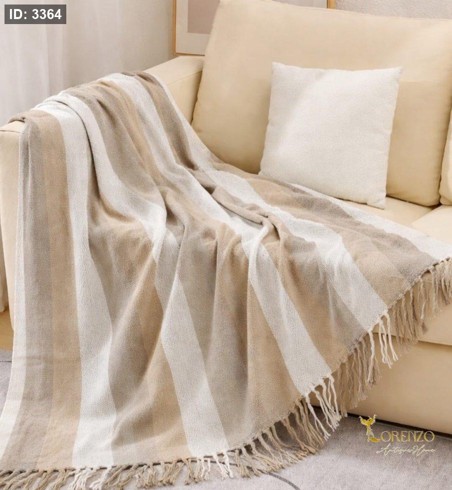 بطانية بتصميم مخطط عريض بدرجات البيج والأوف وايت، تعكس أسلوب بسيط وأنيق يناسب مختلف الديكورات. ملمسها ناعم ودافئ، وتعتبر خيار مثالي لإضافة لمسة دفء وجمال على الكنبة أو الكرسي في غرفة المعيشة.