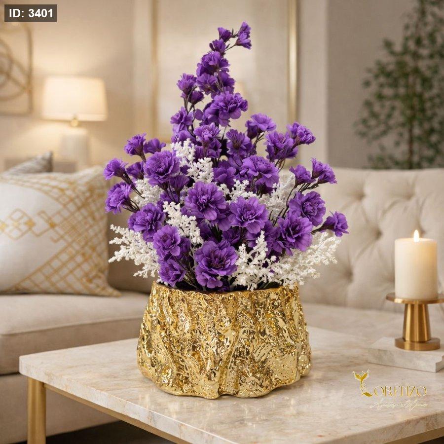 مزهرية ذهبية بتصميم فني بارز وفخم، تحتوي على باقة ورد بنفسجي مع تفاصيل بيضاء ناعمة تعطي تباين جذاب وأنيق. مثالية لتزيين طاولة الصالون أو المدخل، وتمنح المكان طابع راقٍ ولمسة لون مميزة.
