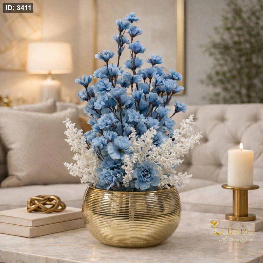 تنسيق راقٍ من الزهور الزرقاء الناعمة مع لمسات بيضاء داخل وعاء ذهبي مخطط بتصميم دائري فاخر. يجمع بين هدوء اللون الأزرق وأناقة اللون الذهبي ليمنح المكان لمسة فخامة عصرية. مثالي لطاولات القهوة، الطاولات الجانبية، أو كقطعة ديكور مميزة في غرفة المعيشة والمكاتب الراقية.
